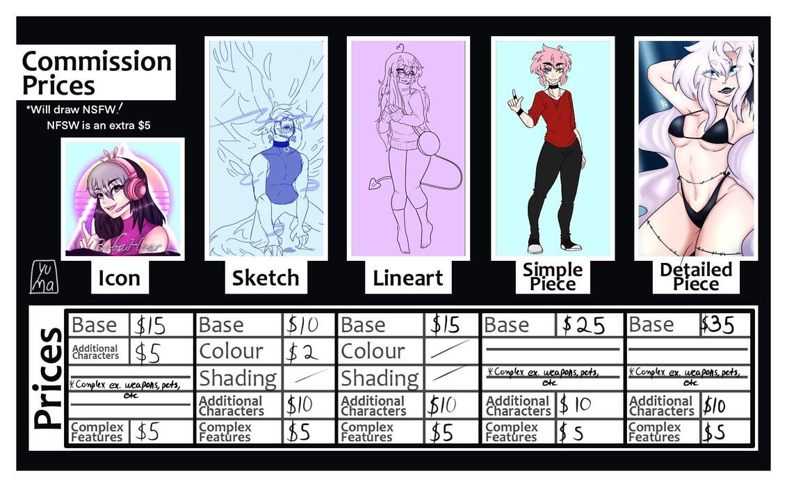 If you clicked on this button, I appreciate it! I have hit a financial struggle and I'm trying to at LEAST earn enough to pay for various bills right now, but I offer a service! I'm basically drawing for donations and even if you don't want art but want to help, please click my Kofi button! I appreciate it! If you DO want art add me on discord YumaStoo#1181 and we can talk details there! I'll also put my prices in an example below! Thank you so much!